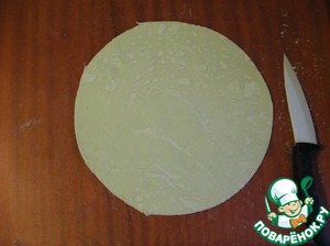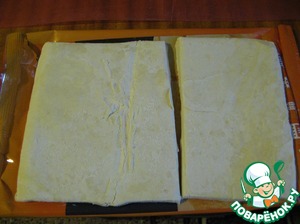 По рецепту нужно 500 г слоеного теста, у меня было только 250 г, чтобы сделать два коржа разрезаю, как видно на фотографии. один корж должен быть больше другого.
