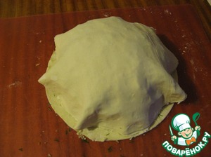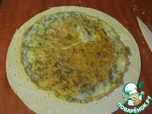 Взбейте яйца с солью. Отлейте часть смеси для обмазки пирога, а в оставшуюся часть добавьте зелень и поперчите. Подготовьте сковороду диаметром примерно в 20 см (размер омлета должен быть чуть меньше, чем коржик из теста). На сильно разогретую сковороду налейте немного масла и вылейте треть яичной смеси (как блинное тесто). Жарьте под крышкой 1-2 мин. Таким образом приготовьте еще два омлета. У меня сковородка 22 см, а омлет я делаю не сразу из всей смеси, а замешиваю по два яйца.