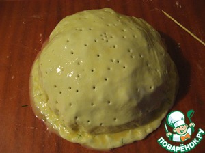 Хорошо подверните и защипните края теста. Обмажьте галету яйцом. Поколите вилкой верхний корж. Следующие два шага забываю делать, из-за этого пирог немного проседает, когда полностью остывает.