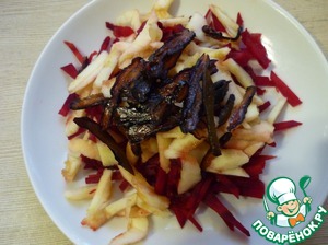 Яблоко измельчите тем же способом, что и свеклу. Промытый чернослив нарежьте тонко