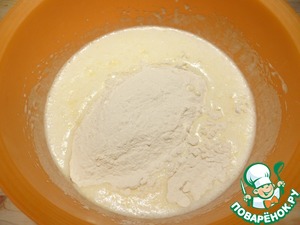 Муку в несколько приемов добавляю к жидкой массе, аккуратно перемешивая ложкой.