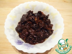 Сначала мою чернослив, обсушиваю его с помощью бумажного полотенца, разрезаю пополам, заливаю коньяком примерно на 30 минут. Затем коньяк сливаю, чернослив опять чуть обсушиваю с помощью полотенца. -