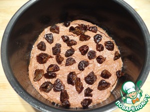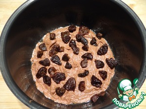 Чашу мультиварки смазываю растительным маслом, выкладываю ложкой треть теста, сверху выкладываю половину чернослива.