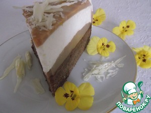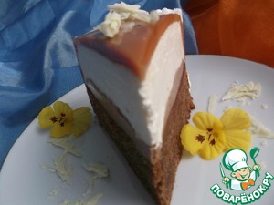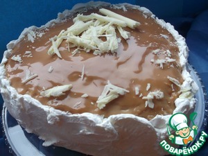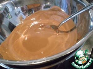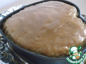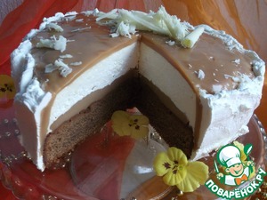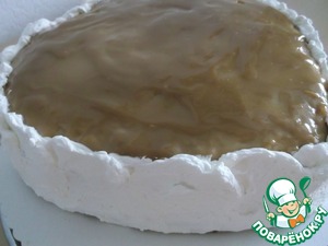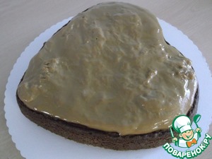У меня получилась карамель в тёплом состоянии очень жидкая, стекала по стенкам торта, поэтому я поставила пирог в рамку и наносила уже остывшую карамель на верх торта, которая уже себя хорошо вела )))