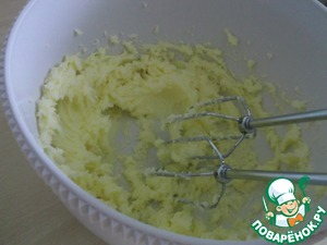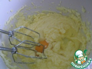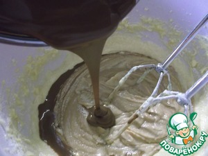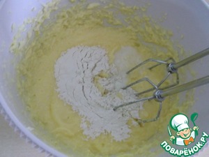 Муку перемешать с разрыхлителем и, чередуя с 75 мл молока, ввести в масляно-яичную смесь.