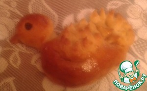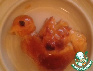 Делаем головку : оттягиваем носик и кладем на одну сторону полумесяца! Втыкаем изюменку - глазик!