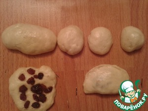 Берем наше тесто и раскатываем " колбасками " толщиной 12-15 мм. Режем на кусочки длиной 5-7 мм. На каждого голубка мы берем по две " колбаски "! Из одной раскатываем кружочек и посыпаем его 1 дес. л. изюма! Вторую "колбаску " режем на три части!