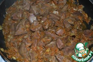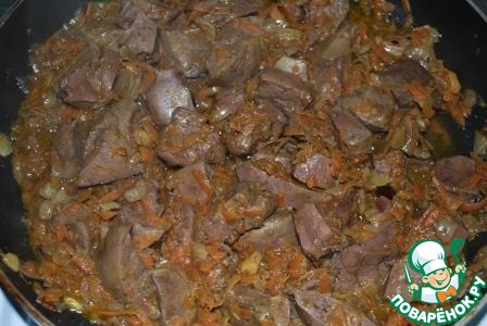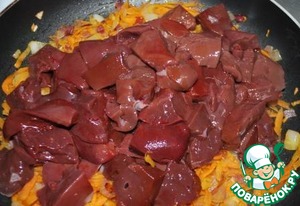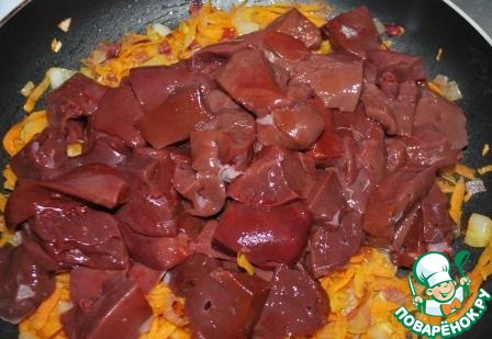6. Когда будет готово, добавить печенку, нарезанную некрупными кусочками.