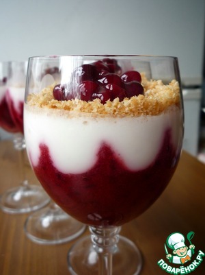 И снова сегодня десерт с клюквой и вишневым конфитюром D'arbo. Мне очень понравилось их сочетание. Итак, берем клюкву, но не всю, часть отложите для украшения, и взбиваем ее с конфитюром (всем за исключением пары столовых ложек, которые тоже оставим на потом).