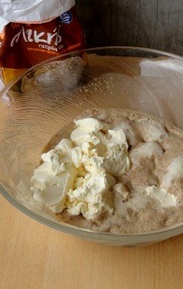 В опару добавить масло, просеянную муку с пекарским порошком.