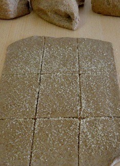 Из каждой части раскатать пласт квадратной формы. Присыпать его сахаром и разделить на девять частей.