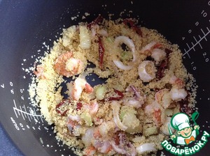 Добавляем кус-кус и вяленые томаты в чашу мультиварки, перемешиваем