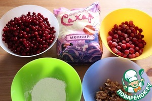 Для начинки нам понадобится: 0,5л банки мочёной брусники без сока, клюква, орех грецкий, сахар Мистраль "Мелкий" и немного картофельного крахмала. -