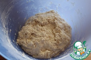 6. Добавить оставшуюся обычную белую (оставив на подпыл) и ржаную муку. Замесить мягкое, не крутое тесто.
