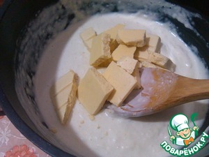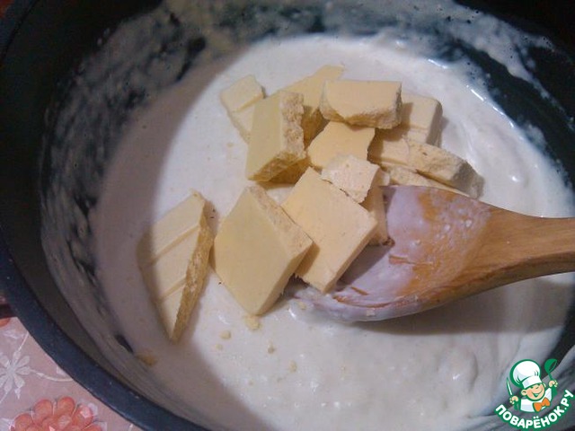 И сразу добавить белый шоколад, размешать и оставить до остывания. Иногда нужно мешать, чтобы не образовывалась пленка.