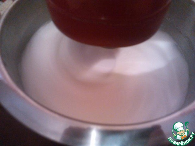 Белки взбивать до появления пузырьков, а затем, добавив большую половину сахара (90 г), Взбить до крепкой, пышной пены...