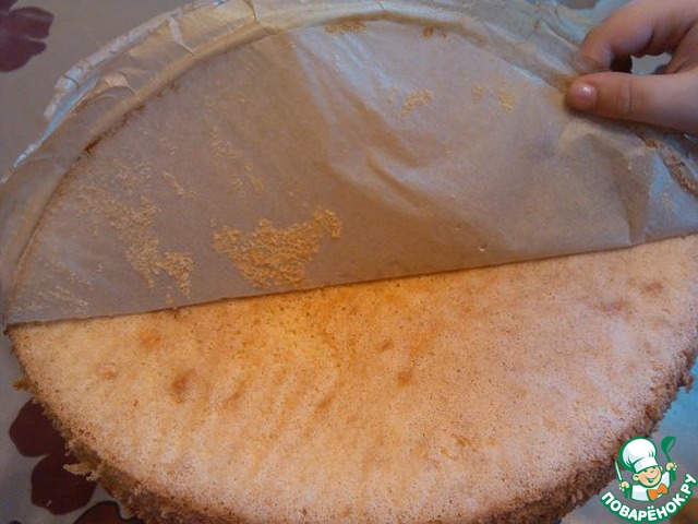 Печь в заранее разогретой до 180 гр. духовке до готовности. Дать немного остыть в форме и затем, перевернув бисквит на решетку, убрать бумагу и оставить до полного остывания.