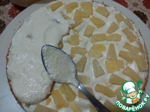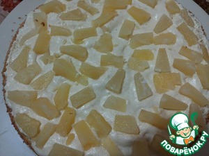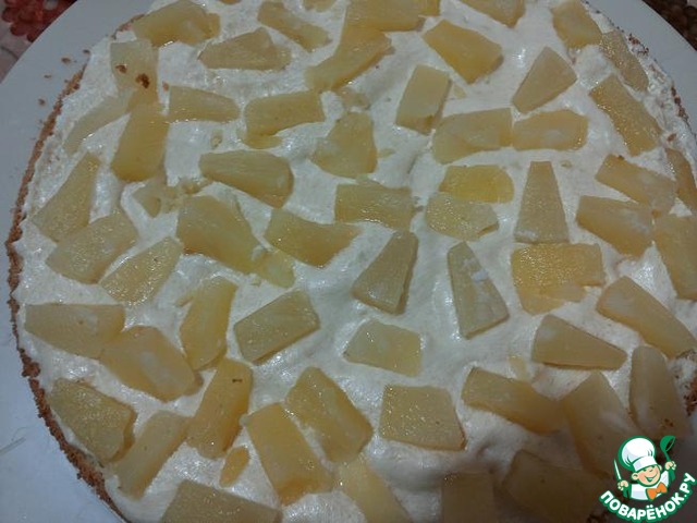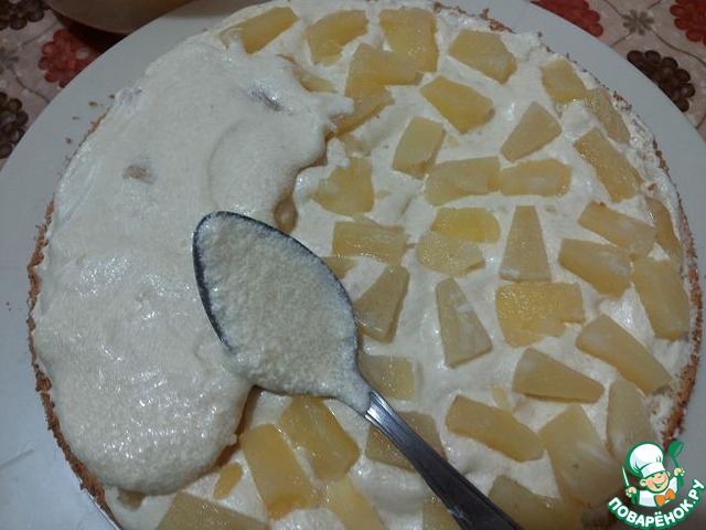 1 корж смазать кремом, сверху выложить кусочки ананаса.
