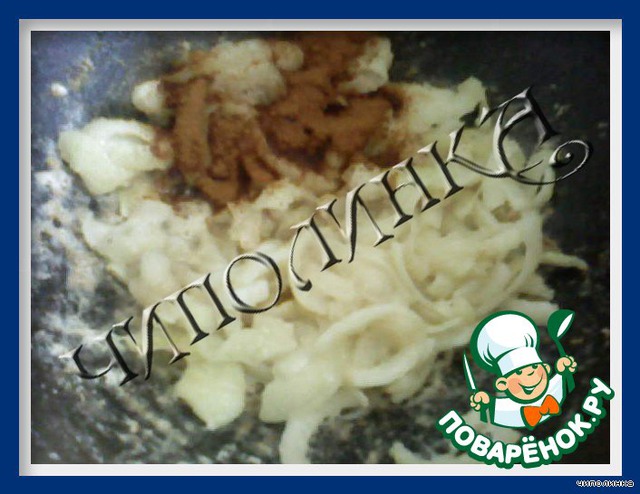 Выложить курицу в тарелку и на оставшемся масле спассеровать лук и муку, добавить красный молотый перец.