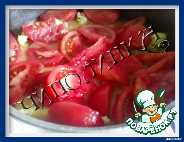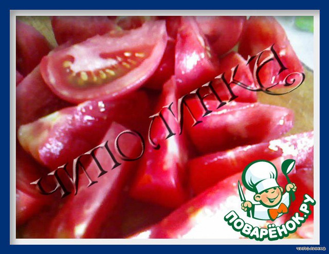 Помидорки ошпарить кипятком, снять кожуру и нарезать дольками.
