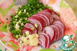 Первым делом надо очистить и нарезать красный лук, измельчить 1 зубчик чеснока,