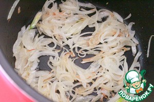 Репчатый лук режем соломкой и пассеруем до золотистого цвета.