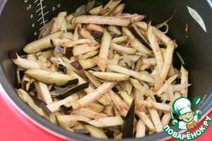 Перемешиваем все вместе с баклажанами, жарим 1 минуту и выключаем мультиварку.