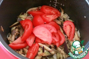 Добавляем к баклажанам 1-2 зубчика мелко нарезанного чеснока и крупные помидоры, нарезанные на дольки.