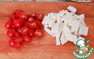 Сыр режем средними брусочками, помидоры черри пополам.