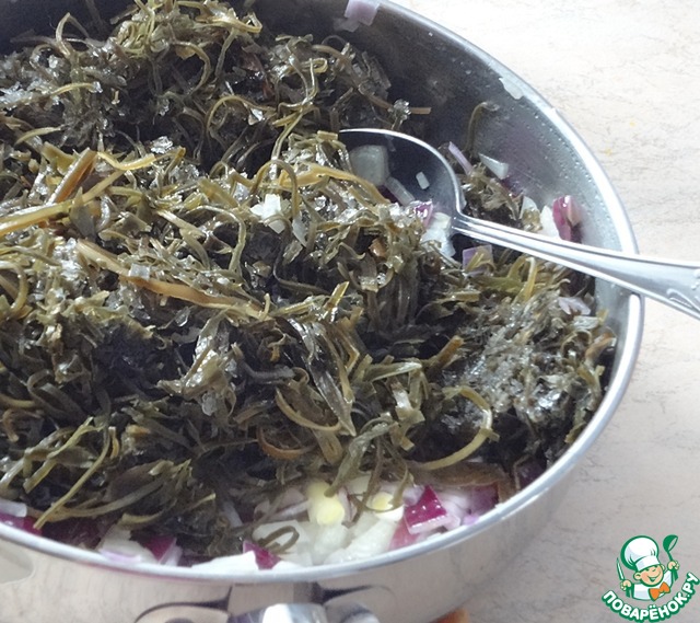 Смешиваем его с массой из морской капусты и лука (примерно две столовые ложки с горкой).