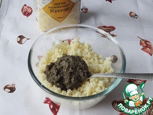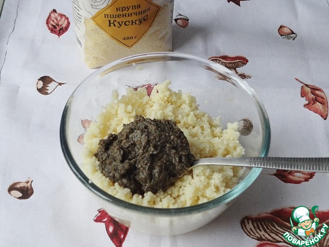 В качестве крупяной составляющей я выбрала кус-кус ТМ Мистраль. Засыпьте крупу в кастрюлю, залейте горячей водой, добавьте столовую ложку растительного масла, накройте крышкой. Через 5 минут взрыхлите вилкой. Кус-кус готов.