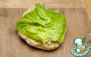 Далее на котлету кладем среднюю часть булочки и повторяем процесс: соус, лук, салат.