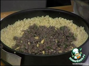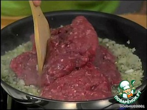 добавляем постепенно фарш и жарим до готовности фарша, -