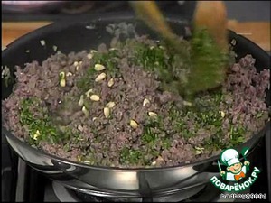добавляем полстакана орешек, мелко резаную петрушку (кто любит, то петрушку можно заменить на кинзу) и корицу, естественно соль и перец