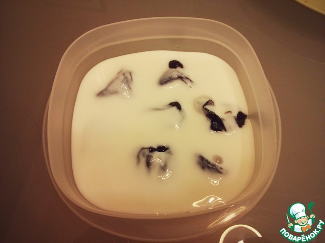 На дно мисочки наливаем половину йогурта. Йогурт надо брать без вкусовых добавок. Самый обычный, не слишком густой йогурт. Мы делаем сами, так что процент жирности не скажу.