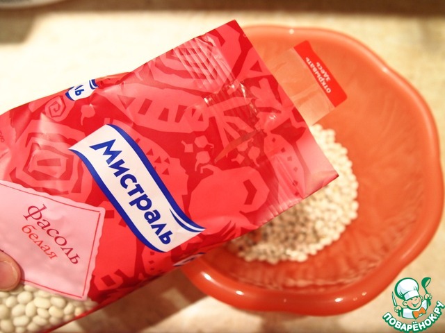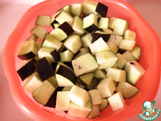 Набухшую фасоль промыть водой и поставить вариться на час. Пока фасоль варится, помыть баклажан, порезать на кусочки и залить холодной подсоленной водой, чтобы ушла лишняя горечь.