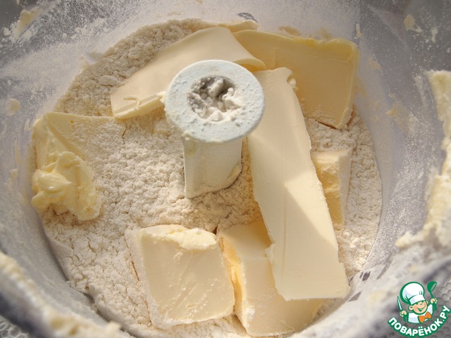 Далее подготовить тесто. Для этого муку высыпать в блендер и добавить маргарин.
