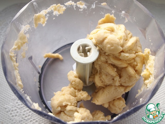 Перемолоть, должна получиться мелкая крошка. Затем добавить холодной воды и перемолоть. Тесто в блендере должно собираться в ком.