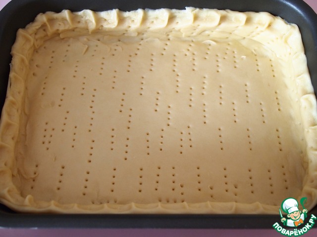 Форму для выпечки (у меня 17х24 см) застелить пергаментной бумагой и распределить тесто. Часто наколоть вилкой и отправить в духовку, заранее разогретую до 200 градусов, на 15 минут.