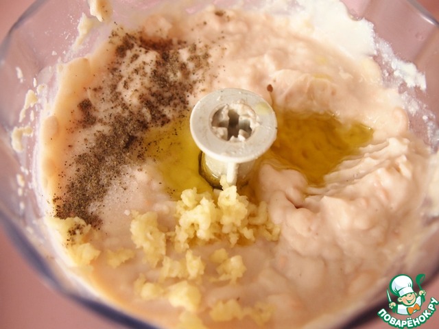 В фасолево-сырную массу добавить соль, перец, оливковое масло и чеснок, пропущенный через пресс. Хорошо перемолоть.