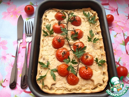 Помидоры на веточке помыть и положить поверх киша, слегка вдавливая помидорки. Отправить в духовку, заранее разогретую до 200 градусов, на 30 минут.