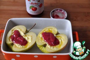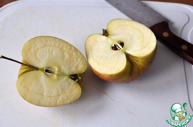 Яблоки моем, разрезаем пополам, ножом намечаем контур, по которому будем вынимать середину, отступив приблизительно по 0,5-1 см от края.