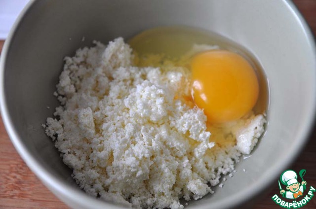 Творог смешиваем с яйцом (если яйца большие, то достаточно половины).