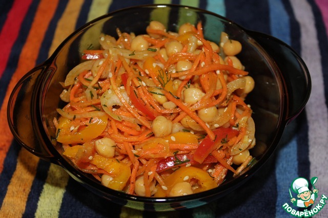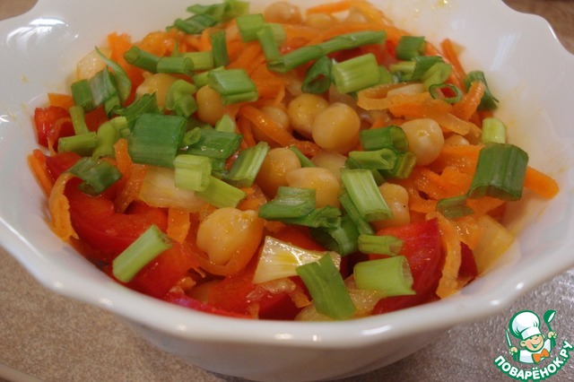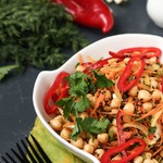 Соединить нут с овощами и корейской морковкой, добавить специи.