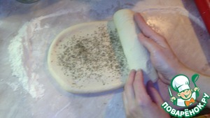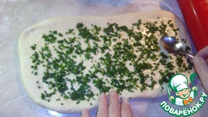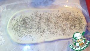 Через час после замеса теста начинается самое интересное) Смазываем растительным маслом стол, нож и свои руки, чтоб тесто не липло. Выкладываем его на стол, разрезаем ножом на три части. Каждую часть раскатываем смазанной маслом скалкой в прямоугольник. Намазываем тесто чесночной и луковой начинкой, третье - посыпаем прованскими травами без масла. Чесночная начинка.