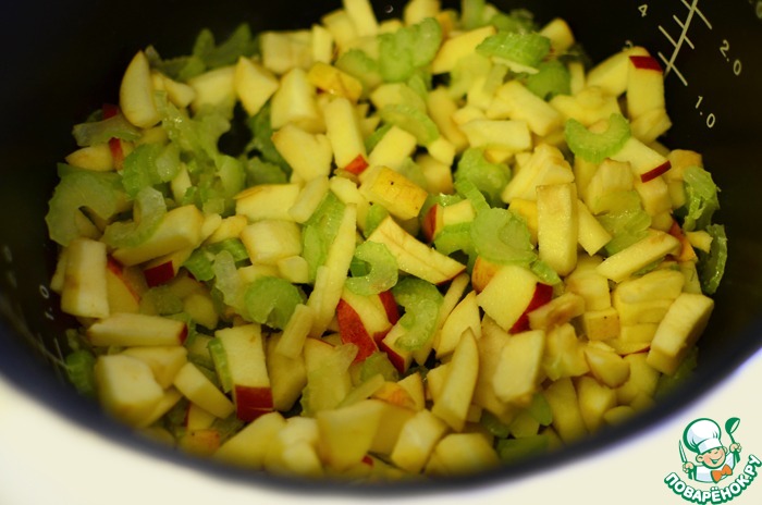 Включите в мультиварке режим Тушение, растопите сливочное масло и потушите сначала сельдерей около 7 минут, затем добавьте яблоко и тушите вместе еще около 5 минут. -