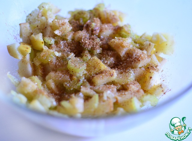 Переложите яблоки с сельдереем из чаши мультиварки в миску, немного остудите и смешайте с сахаром и корицей. Количество сахара зависит от сладости ваших яблок и от вашего вкуса. В процессе приготовления я решила заменить белый сахар на демерару, так как этот сахар имеет легкие карамельные нотки и очень удачно подходит для такого сладкого пирога.