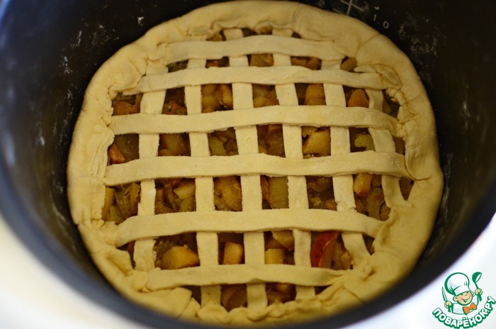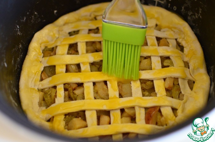 Как я уже говорила выше, в мультиварке верхушка пирогов получается бледной, пирог с такой открытой и сочной начинкой не перевернешь вверх дном. Поэтому мы смазываем решетку пирога яичным желток.