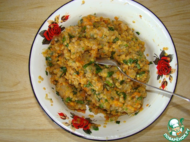 Итак, первым делом приготовила начинку. Отварить чечевицу. Я заливала водой в соотношении 1:2,5 и варила 10 минут, после чего оставила не на долго в горячей воде, что бы она "дошла", стала мягкой, но не разварилась. Вообще автор рецепта использовала 2/3 стакана риса, который отваривала в течении 2-3 минут после закипания. Куриную грудку пропустила через мясорубку с луком. Морковь порезала мелкими кубиками и потушила на антипригарной сковороде с небольшим добавлением воды (в оригинале рецепта овощи обжариваются в масле). Смешала фарш, чечевицу, морковь, мелко рубленную зелень и сырое яйцо. Начинка готова. Должна заметить, что соблюдение пропорций абсолютно не обязательно))) Если вы не следите за потребляемыми калориями, любите больше мяса, можно убрать крупу и взять две куриные грудки или заменить их другим видом мяса.