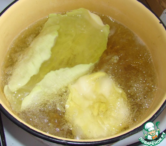 Далее необходимо отварить капусту и разобрать на листья. Это можно сделать любым удобным для Вас способом. В оригинале рецепта рекомендуют "наколоть кочан на разделочную длинную вилку и опустить в кипящую воду. Через 2 – 3 минуты подрезать 3-4 верхних листа и снять с кочана (к этому времени верхние листья успеют немного подвариться и должны сняться без всяких усилий). Прижать снятые листья кочаном и варить дальше. Через 2 – 3 минуты снять еще несколько верхних листьев, и т. д. пока весь кочан не разберется на отдельные листья. Периодически нужно проверять готовность снятых листьев. Готовые (пластичные, легко гнущиеся, но не переваренные) достать из кастрюли." Я с варкой капусты столкнулась первый раз, переживала, что переварю поэтому после того как отделила несколько листочков, я кочан вынимала, ждала когда листья дойдут до "кондиции", вынимала их, затем снова опускала кочан и отделяла листочки. И так до тех пор пока не остался маленький кочанчик, из него вырезала кочерыжку и отварила до готовности. Думаю у тех, кто хоть раз варил капусту на голубцы никаких сложностей не возникнет.